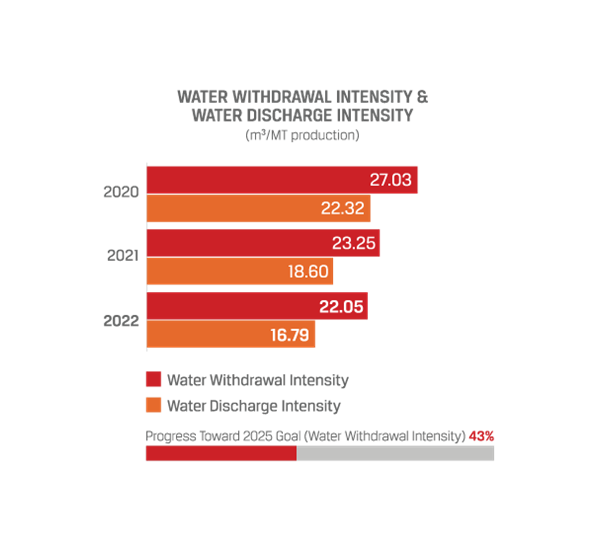 私たちは最近、地域の水ストレスレベルまたは節水の可能性に基づいて、8 つの優先サイトで水収支と水効率の評価を実施しました。 水収支 評価では、取水、使用、排出のパターンを測定します。当社の包括的な 水効率評価では、各工場で水がどこでどのように抽出され、使用されているかを分析し、 水効率の向上とプロセスにおける水使用料の削減 のチャンスを明らかにします。この分析に基づき、当社は漏水に対処して 水の損失を減らし、 いくつかの潜在的な節水のチャンスを特定しました。これにより、2025年の持続可能な取水量目標に向けて、水パフォーマンスの継続的な改善を推進していきます。